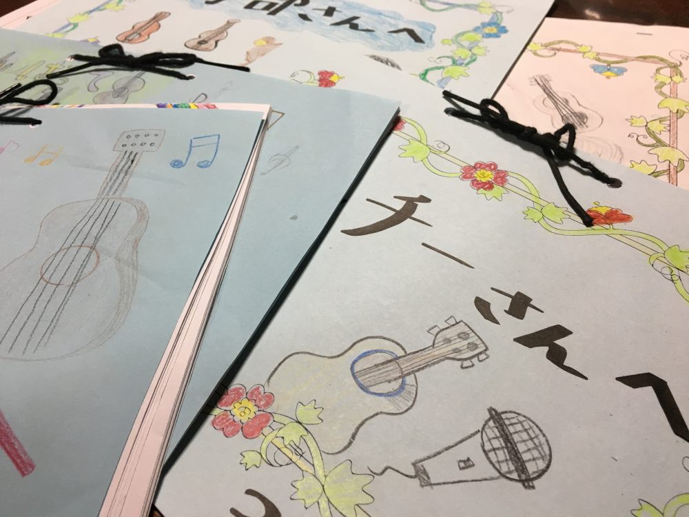 先月タッチーさんと一緒に行った小学校からお手紙集が届いた。すべて読ませてもらった。どうもありがとう。丁寧に色が塗られていたりイラストがあったり。表紙にはいろいろなギターが描かれていてとても興味深い。こういう印象なんだなって。共通しているのは、ブリッジが記憶に残らないということ。タッチーさんに届けに行かなくちゃ。