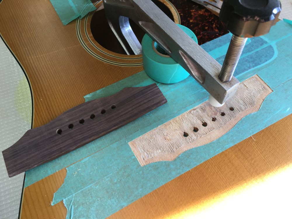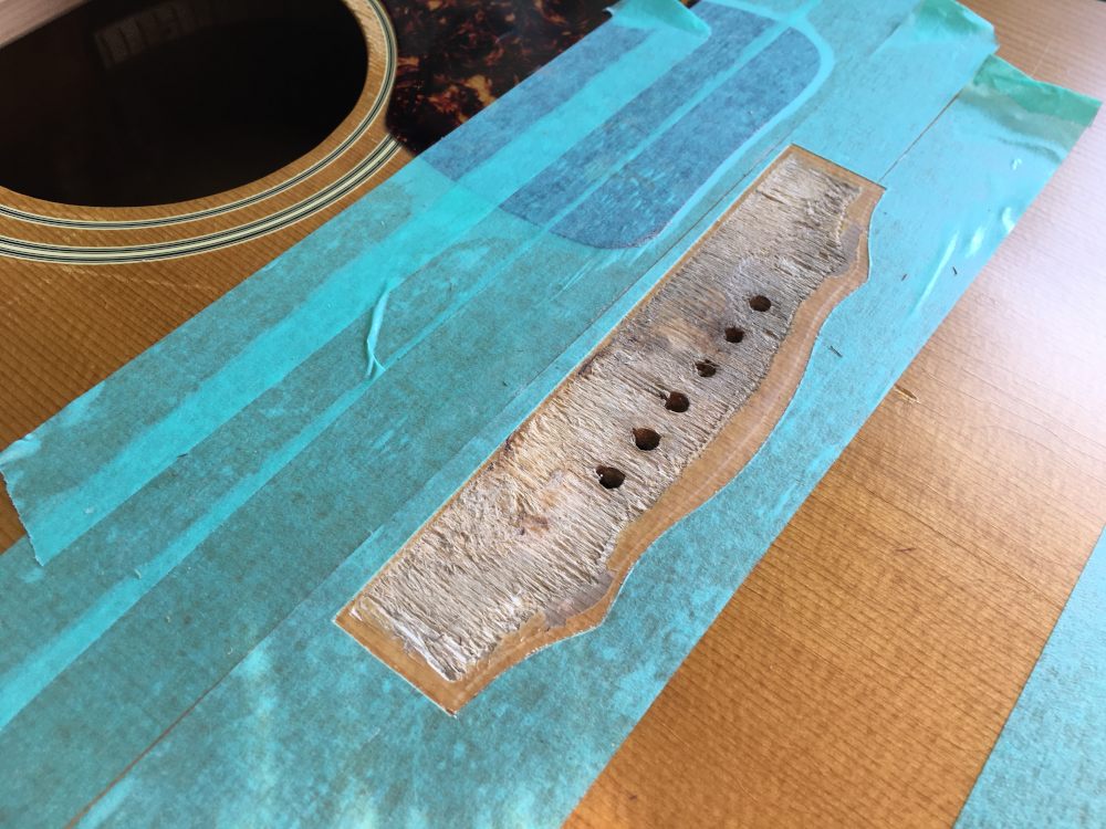 ブリッジ再接着をば。ブリッジ裏は現在のトップのアーチに近づけて研磨。正しく接着強度を出すためにもブリッジと同じ形に塗装を剥がしましょ。