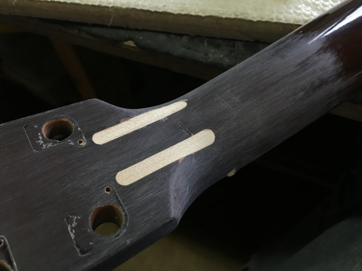 塗装のすきまにネック折れ修理は研磨して塗装準備。これもいつ吹けるかねぇ。