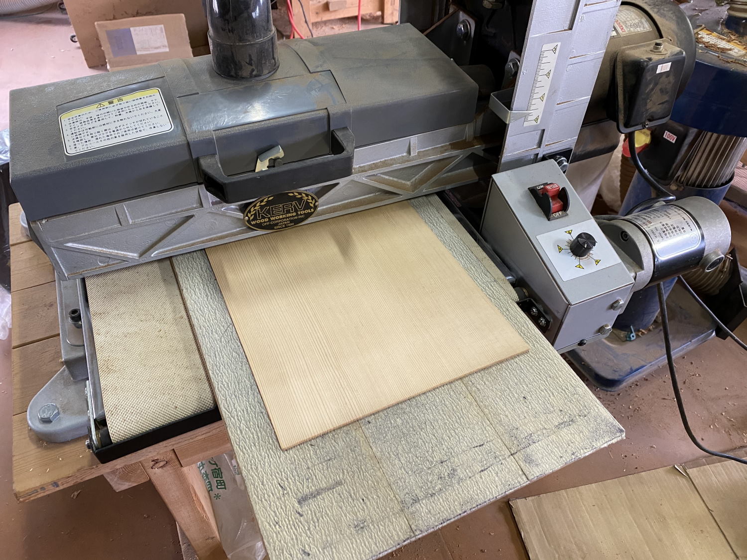 大問題発生。材料の厚み出しに使用しているドラムサンダーが突如ぶっ壊れた。交錯木理や杢の出た材、表面がめくれやすいトップ材などの製材の仕上げに不可欠。材料を送るためのバーがちぎれた模様。こいつが無いと製作がスタートしない。買った店舗を見るともう同じようなものは無く200Vの機械のみ。修理可能かどうかもまだわからない。他を探すの?いっそ200V引くの?オーダー品を始めようとした矢先、納期も守れない可能性が浮上。先日の糸鋸盤よりもピンチだわぁ。