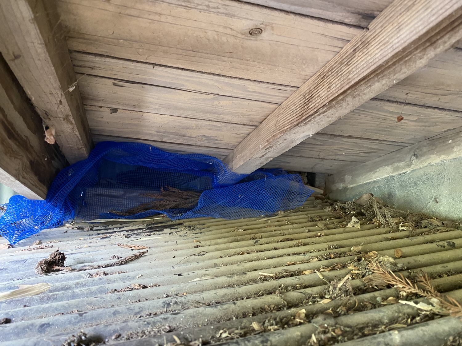 またしても作業場にネコ侵入の痕跡。猫除け機の効果がイマイチなので直接ふさぐしかない。かろうじて片手が届いたのでタッカー使って進入路と思しき場所にネットを張った。今にも割れそうな汚く弱い波板の屋根に寝そべってギリギリ頭が入るスペースにもぐり込んでの作業は決意の現れ。あとは立入禁止の張り紙か。