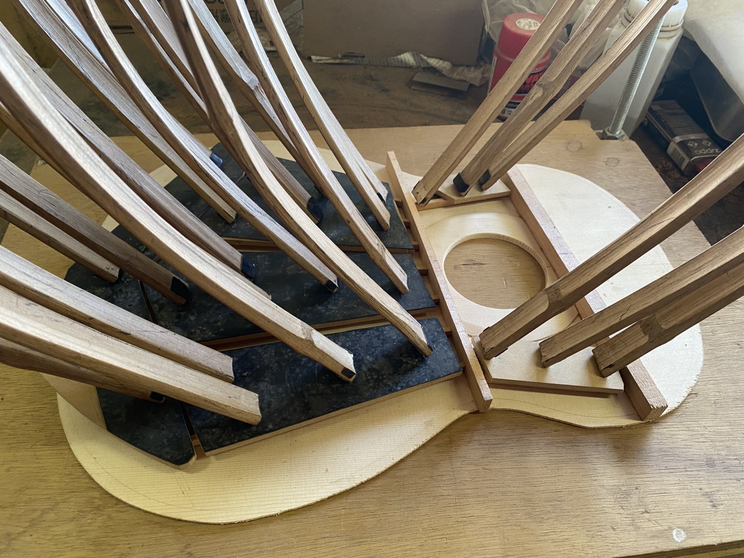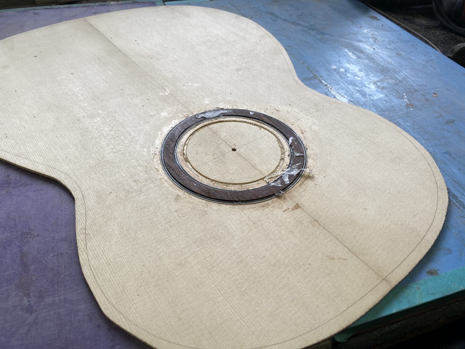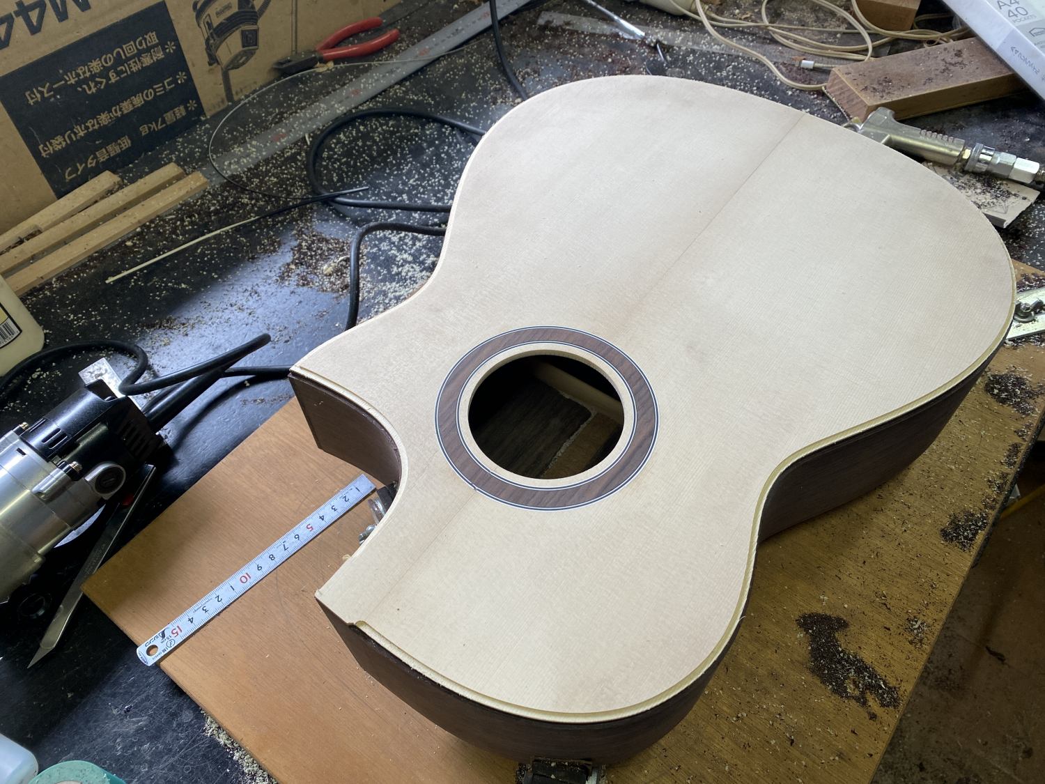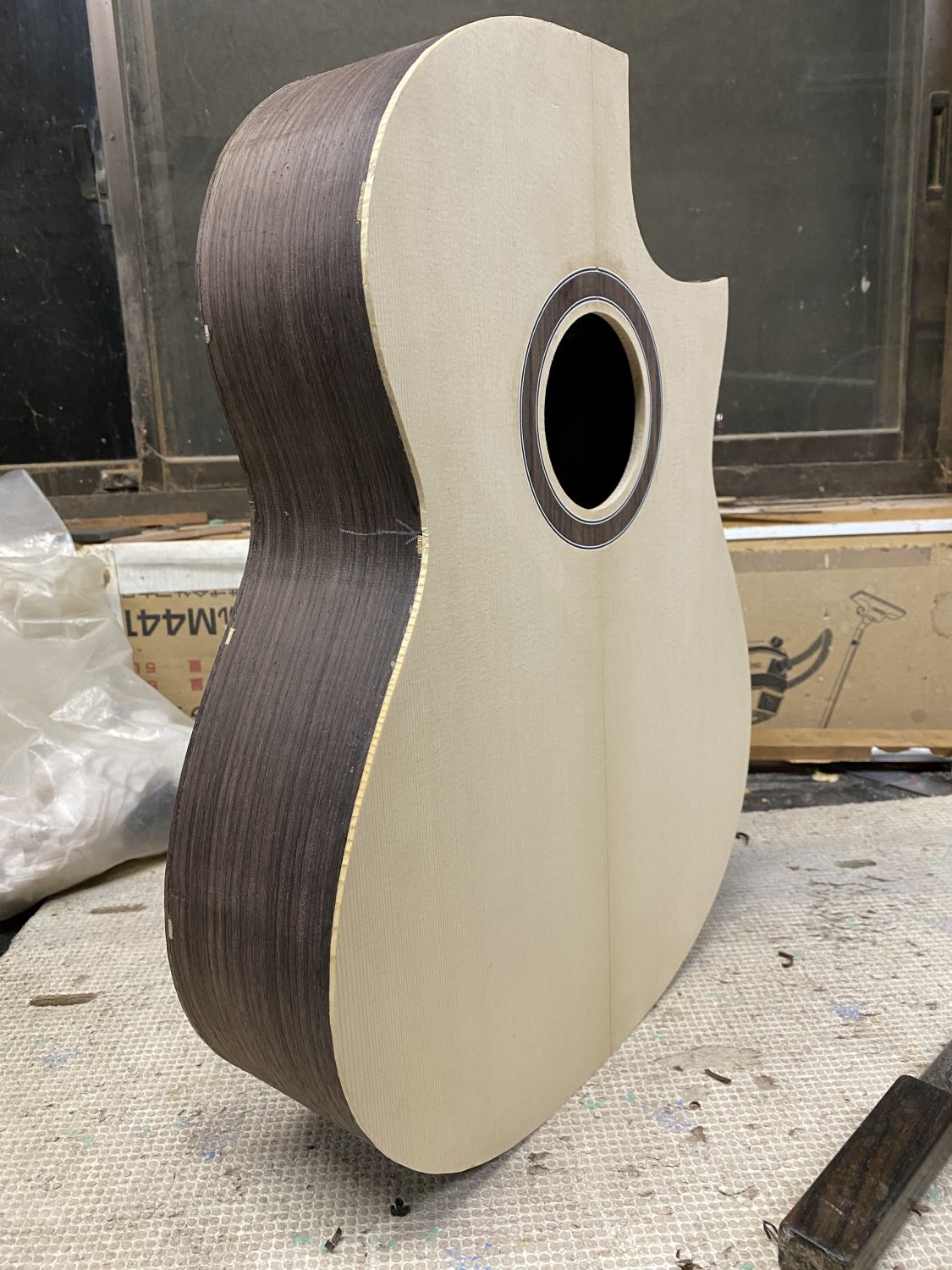 製作中のガットが箱になった。この後はサイド磨いてバインディング入れてコンター削って、とまだボディ作りは続く。