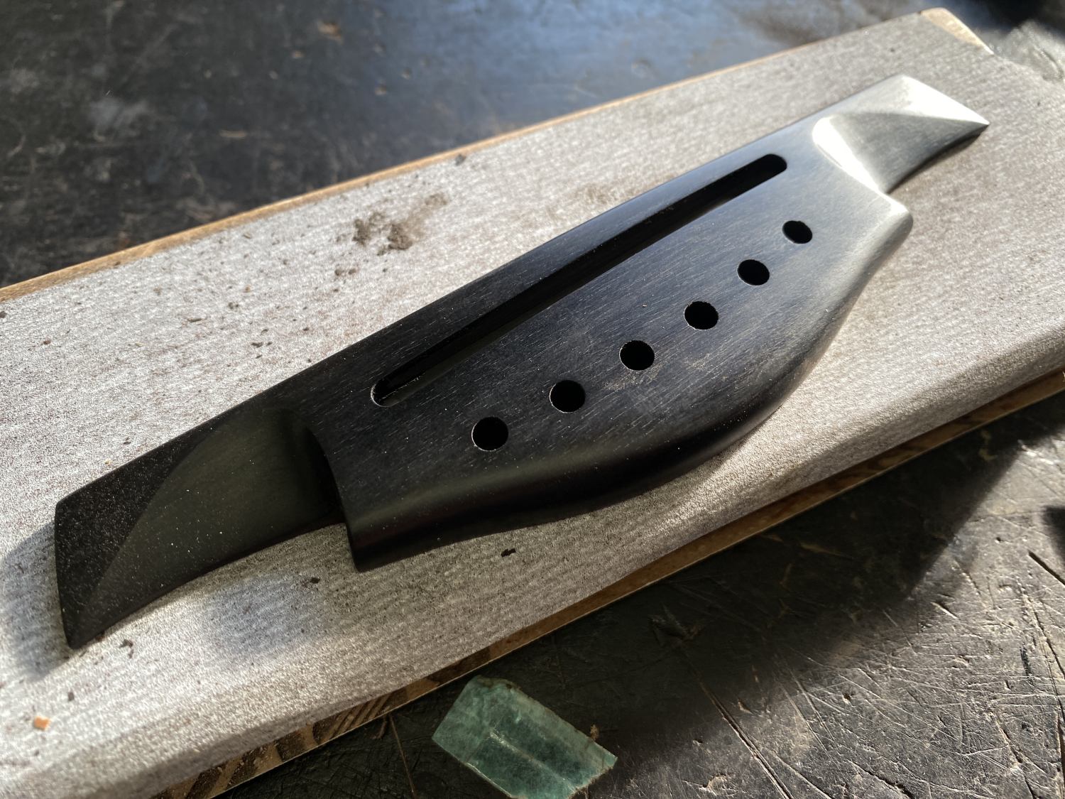 しばらく前にバフがけしたギター、やっとブリッジを作った。この子を完成させるのが当面の優先かなぁ。ヘッド折れ2本の修理はボディ側の修理にめどがついたので塗装準備だ。
