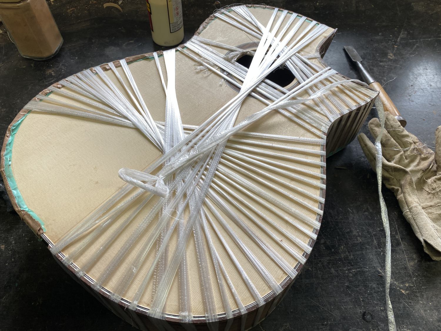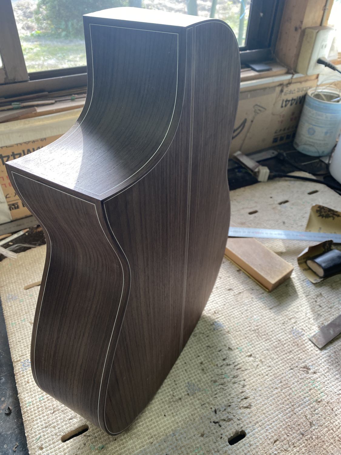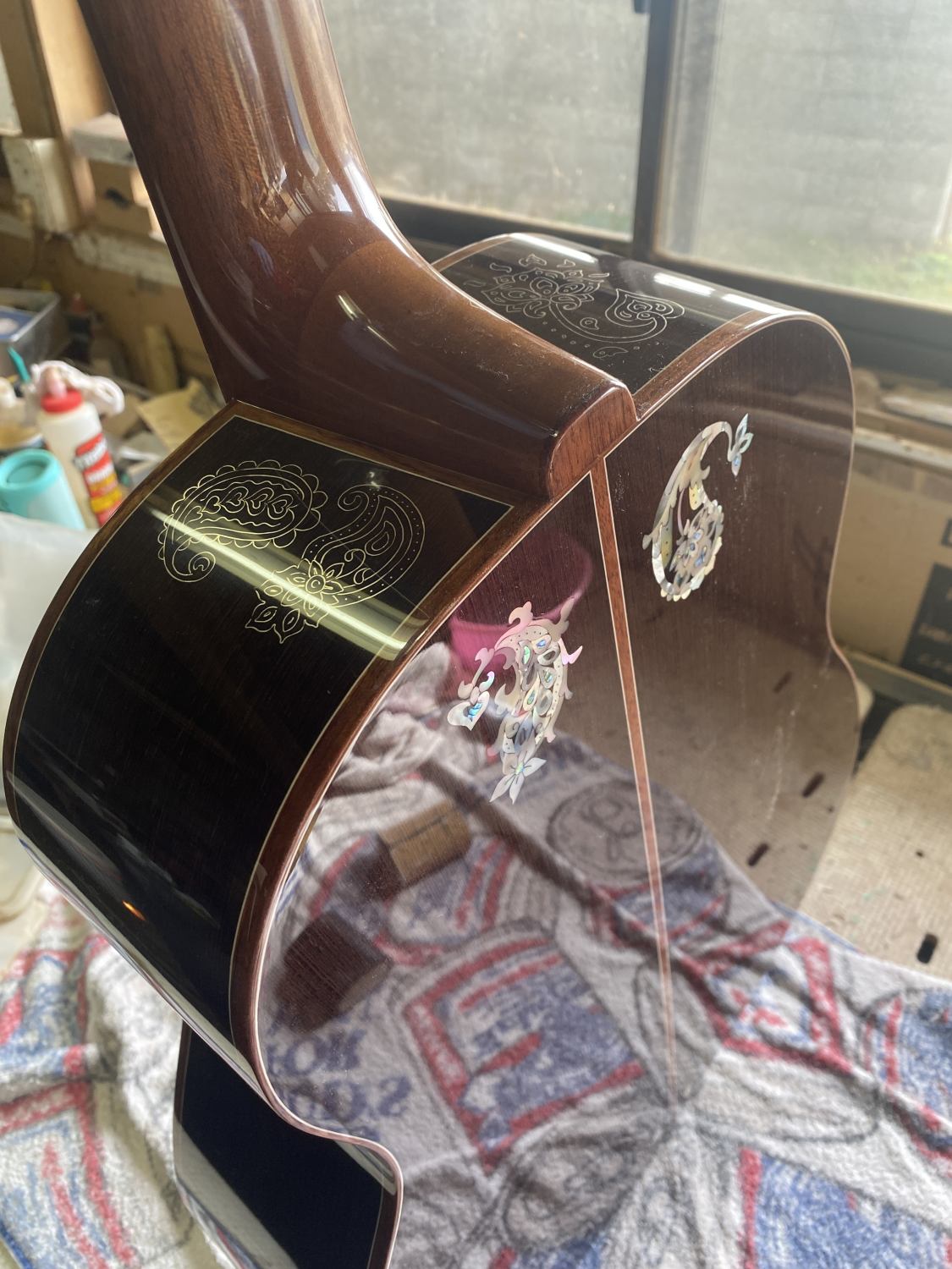 作業進捗。ペイズリーのギターにトップコートを吹き付けた。それからガットはパーフリングを接着した。