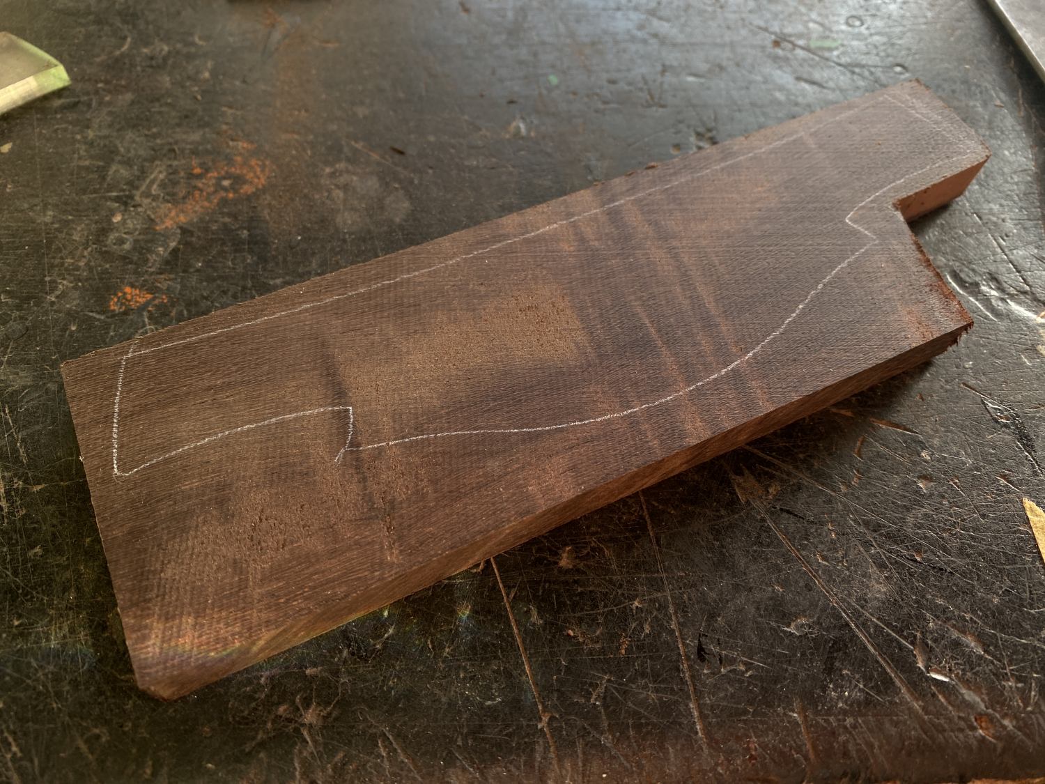 やりたかったインレイと使ってみたかった材を盛り込んだこのギター、ブリッジも初めてのものを。カタロックスってやつ。別名メキシカン・ロイヤル・エボニー。名前の通り硬い。エボニーはカキノキ科、これはマメ科。木目が少しうねっていてとても加工しづらい。