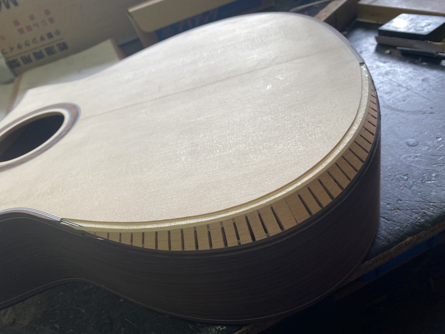 エルボーコンターの加工、パーフリングの溝も完全に手掘りなので難しいのよ。