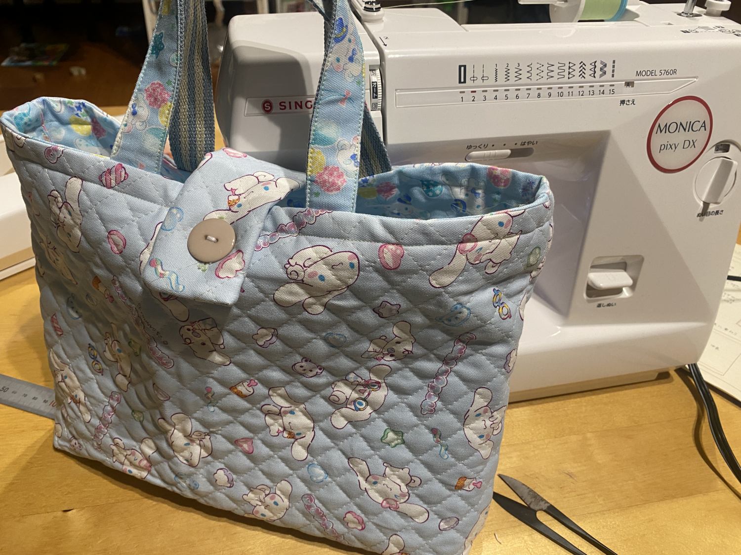 もうすぐ小学校なので深夜のお道具袋製作。内布あり。買った時の端のガタガタ、どうせ隠れるところだからとそのままにしない方がいい。色々ずれてわけわかんなくなる。あと間違えてボタンが裏側になっちゃった。いや、ネームプレートが裏になったのか?致命的なミスがありつつも袋は完成。