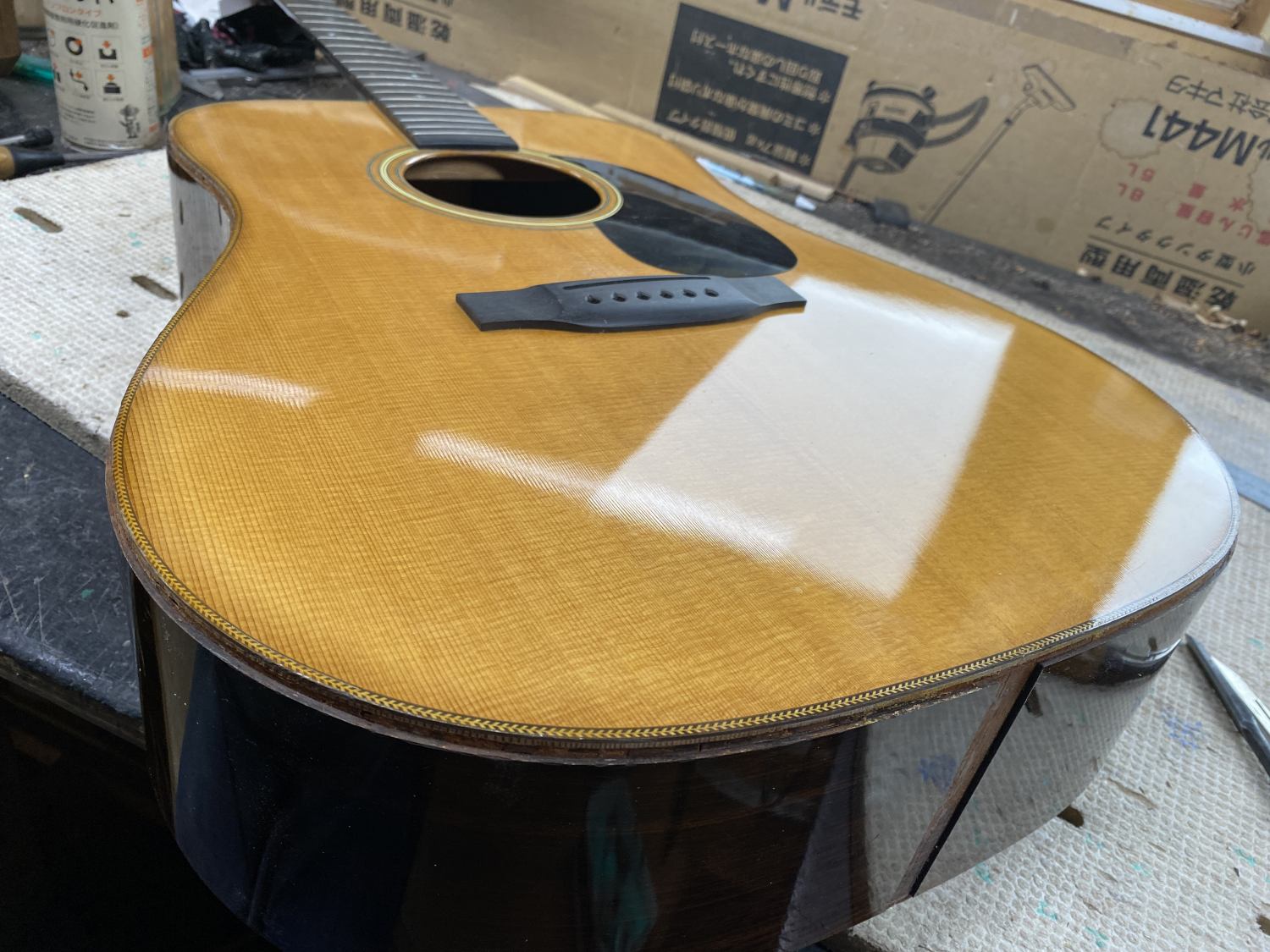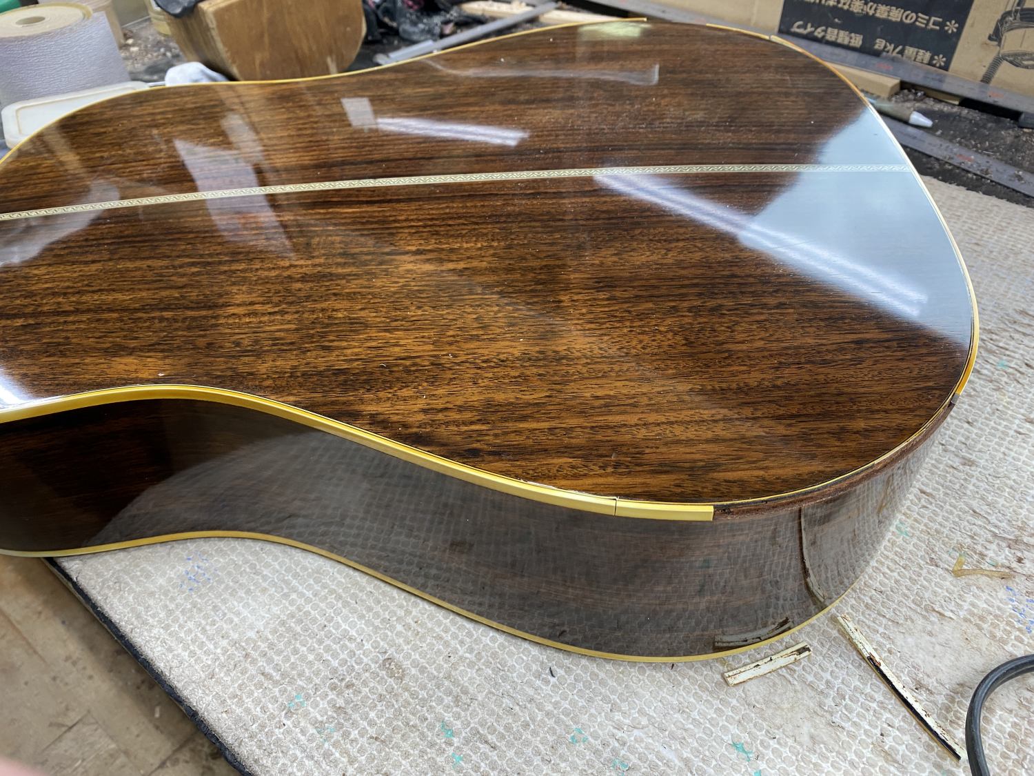 次に来た修理はバインディングが劣化してパキパキに剥がれ落ちるからいっそ新しく巻き直してほしいという依頼。デメリットやそのまま固定する手も説明したけどやることになった。指板下に入り込んだ部分は抜けなかったので切断。美しくなかったのでボディエンドも交換することにした。年代、メーカーまるで不明だが材はとてもいい。