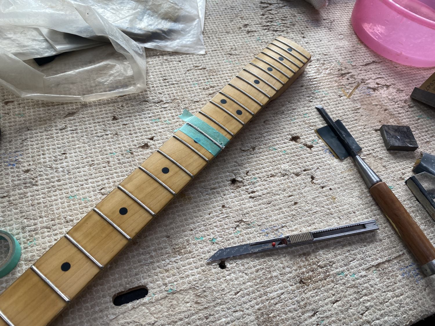 メイプル指板のフレット交換を完了した。フレットの塗装剥がすのってこんなに大変だったけか。