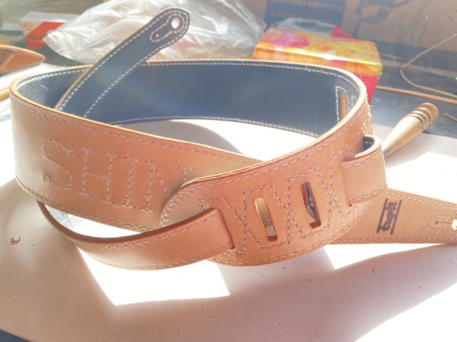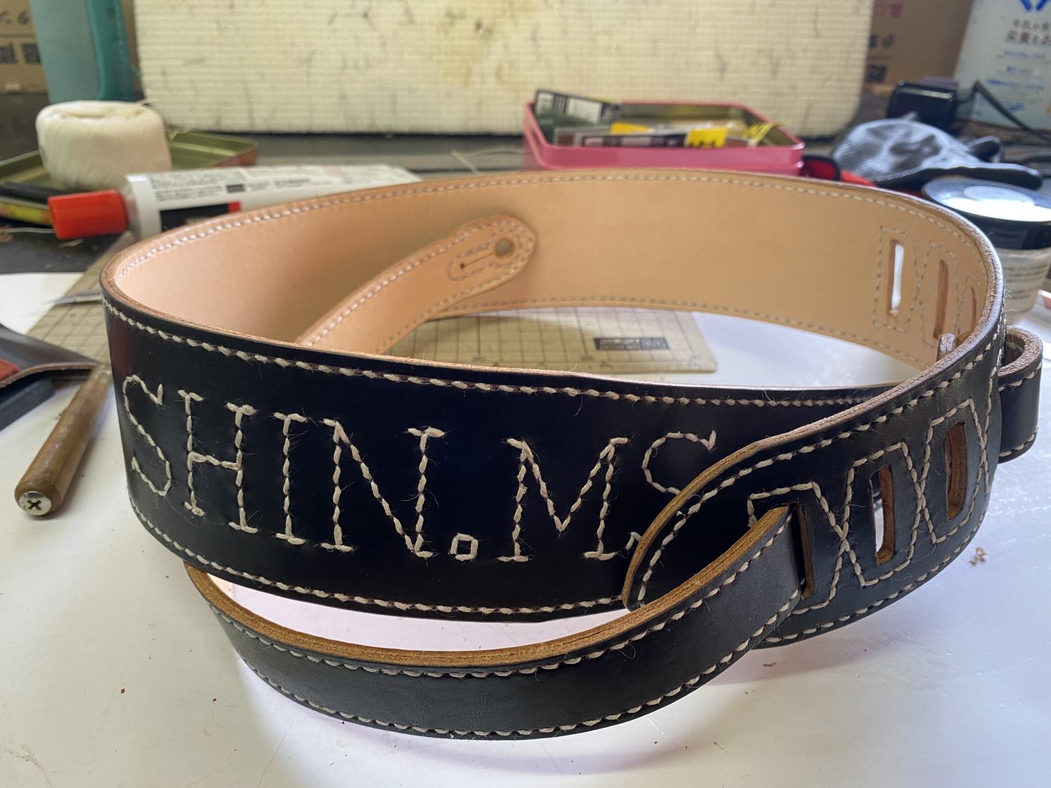 久しぶりの革仕事。半年以上お待たせしてようやく着手。リバーシブルのギターストラップ(名入り)。名前とかバンド名入れるのってお客さん(Tさん)発案で、その後たいていがそういうオーダー。ストラップも俺専用がいいよねぇ。名前とかって今の時代美麗なレーザー加工とかもあるだろうけれど超無骨な手作りですんません。
