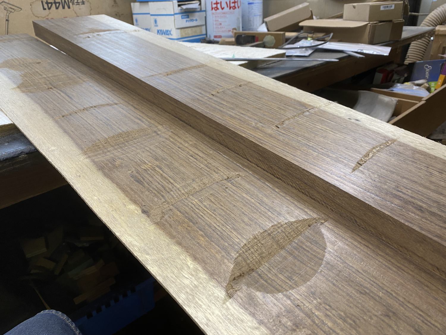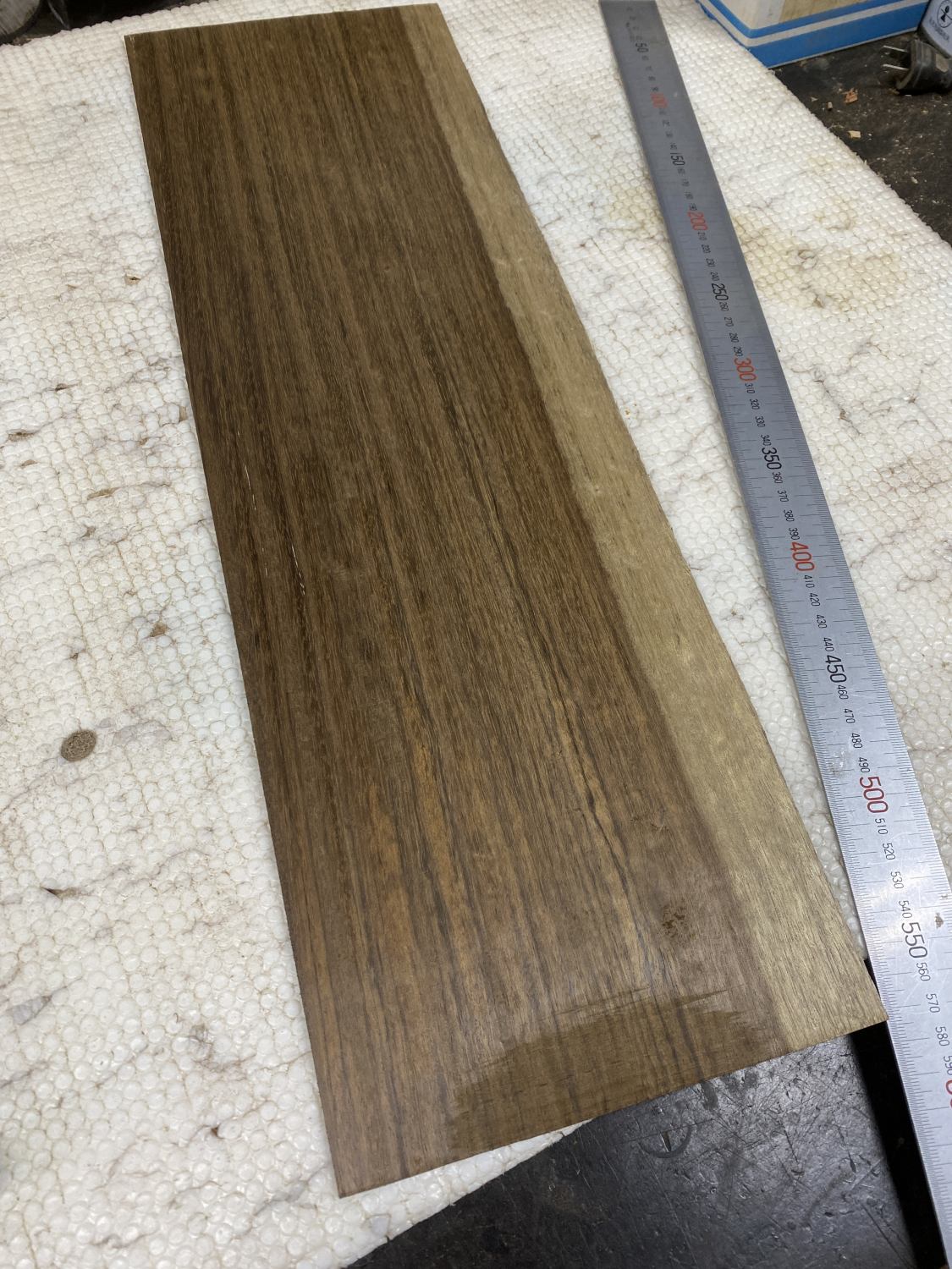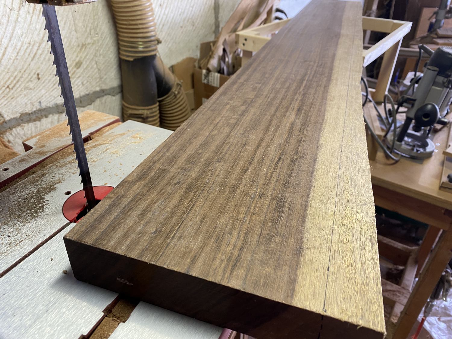 白太のあるヘッドプレート材を入手しようと買ったこちらのオバンコール、スライスに挑戦。まず幅がありすぎてバンドソーに入らないので耳を落とす。それから丸鋸で溝を切っておく。