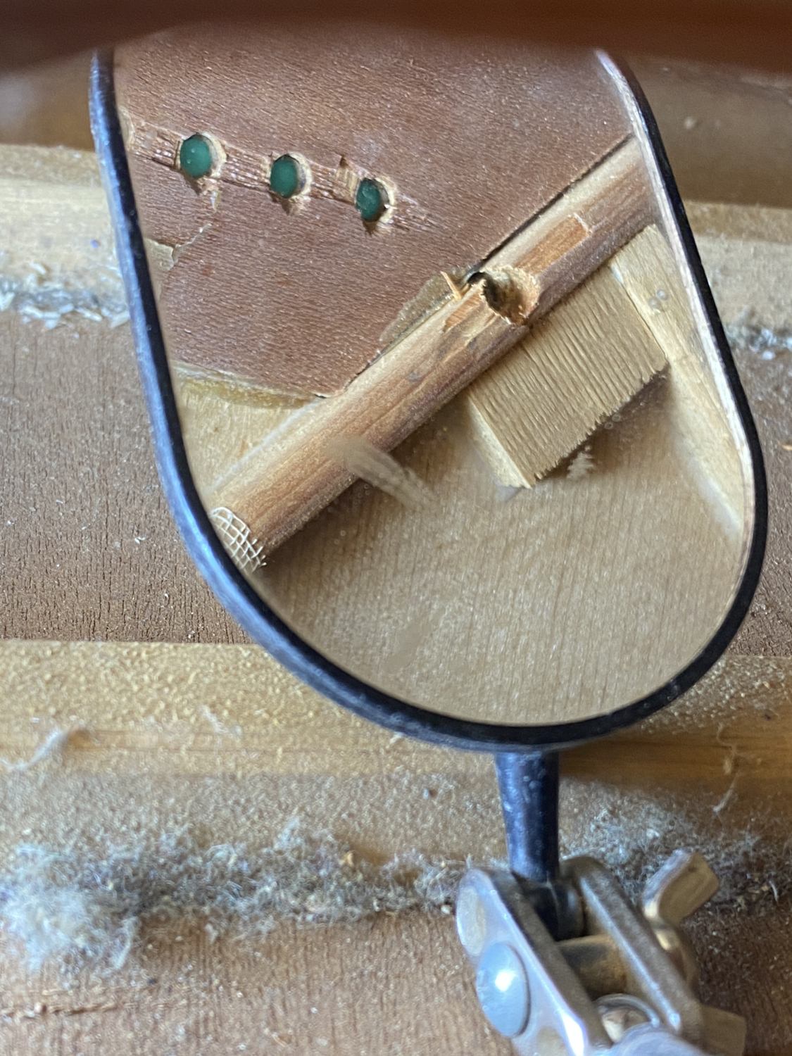 アジャスタブルブリッジのエレキ用みたいなブッシュがXブレーシングをクリティカルヒットで貫いて折れて剥がれている。ボンドを入れる隙がないので瞬間流し込んで一応貼るけれど、張力に耐えられる保証なし。おそらく素人改造でひどくお粗末。力木交換レベルだけど合板だしやるなら表交換レベル。その他もろもろゲンナリ。そりゃぁトップ歪んでブリッジ剝がれるわな。ブリッジ貼りなおしてどれだけ持つかな。