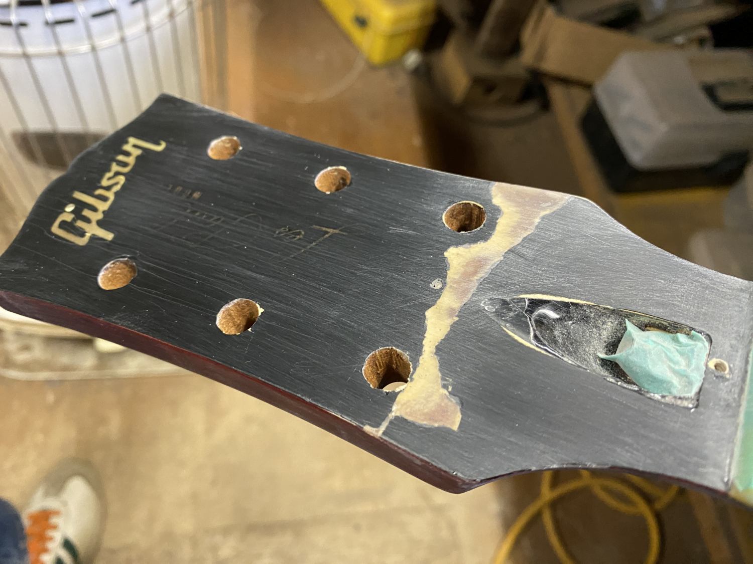 鬱展開の修理品たち。塗装重ねるためにサラッと研磨傷入れ作業したらレスポールのシールが消えた。トップコートの上に貼られてた?!
