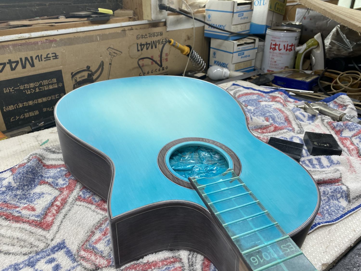 作業はフレット交換と塗装。フレット打って気づいた指板幅の広いこと。塗装は補強材のメイプル隠しとバンジョーネックのトップコート。