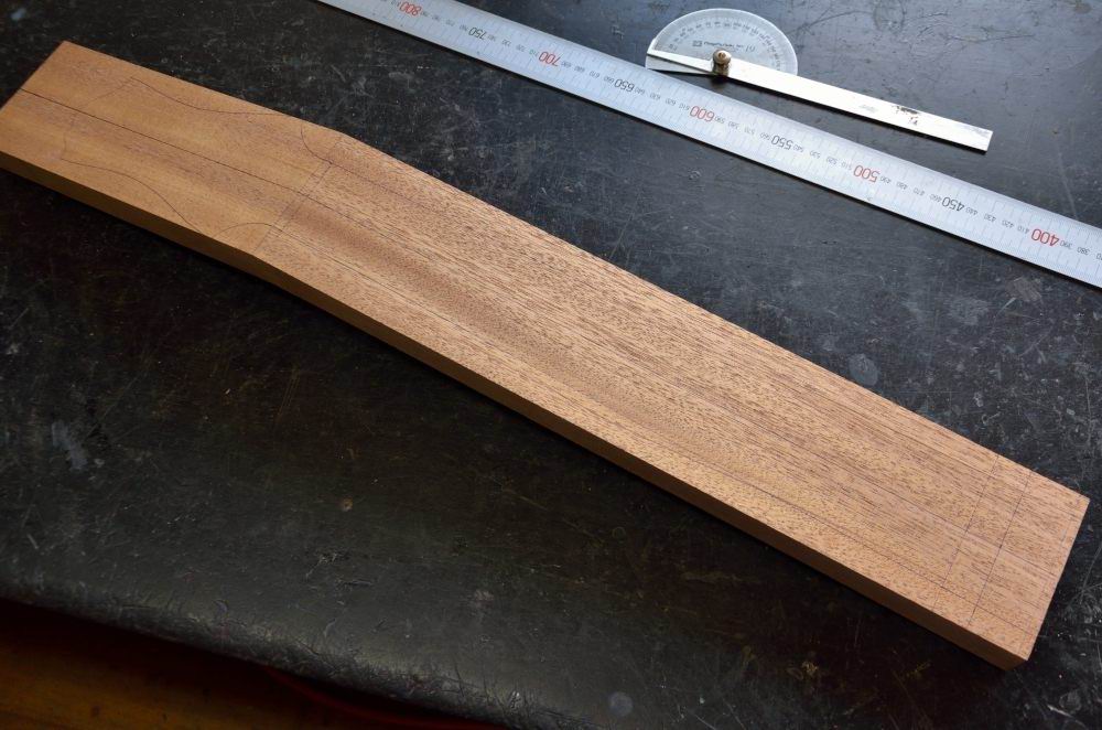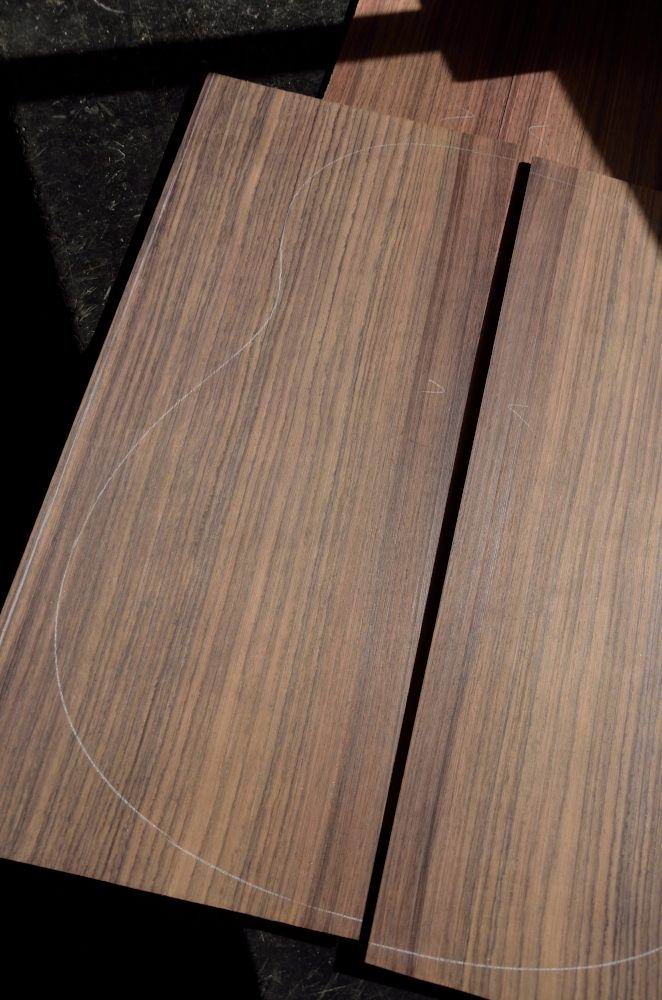木取りを決める。ローズウッドの場合、サイド材からバインディング材、バック材からバックセンターとホールロゼッタやヘッドプレートも取りたい。たいてい足りない。 |