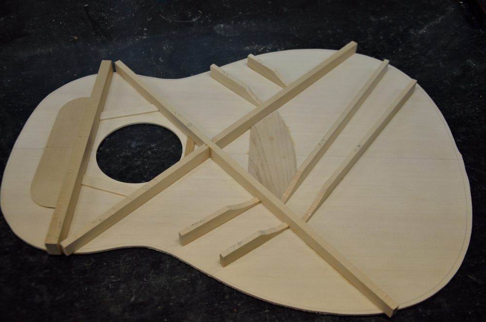 ブレーシングの接着にはニカワを使用。楽器の接着にはニカワが最上だという意見もあるようだが、適材適所だと思っていて、