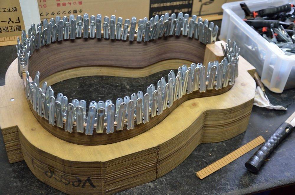 曲面を意識して側板の接着面を整え、割れ止めを接着。甲板接着は裏板から。 |