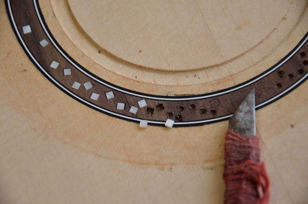 鉄工ヤスリから作ったノミを使って一つ一つ掘って埋め込む。 |